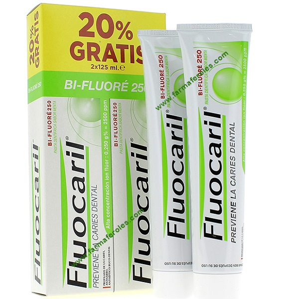 Fluocaril Bi-Fluoré 250 posee también una acción anti-sarro que facilita la fijación del flúor sobre el esmalte y previene la inflamación de las encías. Fluocaril Bi-Fluoré 250 duplo 2 x 125ml está a su disposición en farmaferoles.com al precio de 5,80 euros.